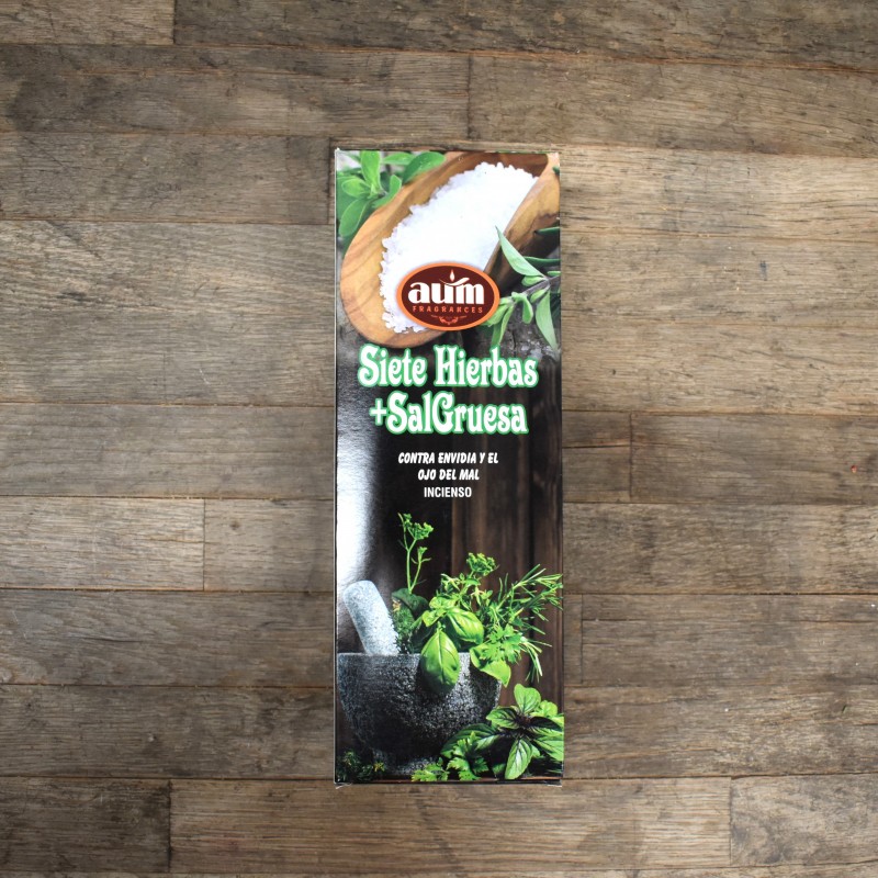 Incienso de la marca AUM, elaborado artesanalmente con productos naturales, incienso de 7 Hierbas Sal Gruesa