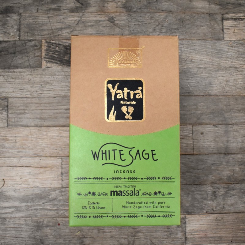 Incienso de calidad premium masala, de la marca PARIMAL. El exquisito aroma de Yatra, su fragancia mas clásica, ahora mezclada con la pureza de la Salvia Blanca.